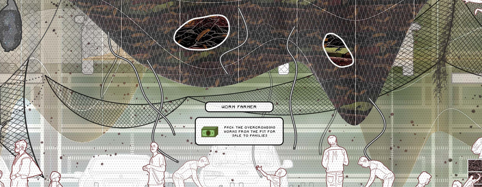This netted structure is more than a playground; it is a dynamic framework that evolves with public participation. Its form and function adapt based on the volume of food waste collected and subsequently, the quantity of compost produced. In this way, the architecture itself becomes a living, changing entity, reflecting the community's engagement with sustainability practices. This approach ensures that the structure not only serves as a physical embodiment of waste management principles but also as an educational tool that evolves and morphs in response to the community's waste reduction efforts, making sustainability a visible, tangible part of daily life.