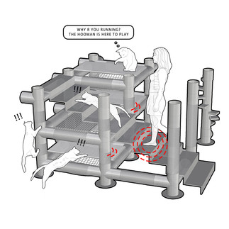 The next consideration included the dynamics and relationships between different users within the prototype. The main users would be the residents as well as the local stray cats, who are the main subject of the project. However, we also considered "intruders" such as pet dogs and how the cats would move through the prototype in such a scenario.